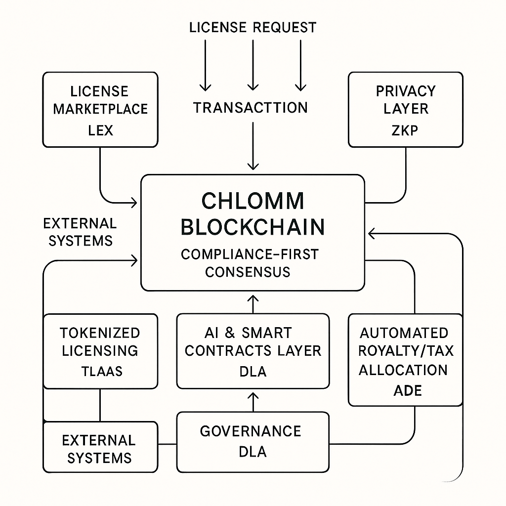 CHLOM™ – Compliance Hybrid Licensing & Ownership Model A blockchain-based framework integrating real-time licensing, automated compliance enforcement, privacy-preserving identity, and programmable royalty/tax allocation at the consensus layer.