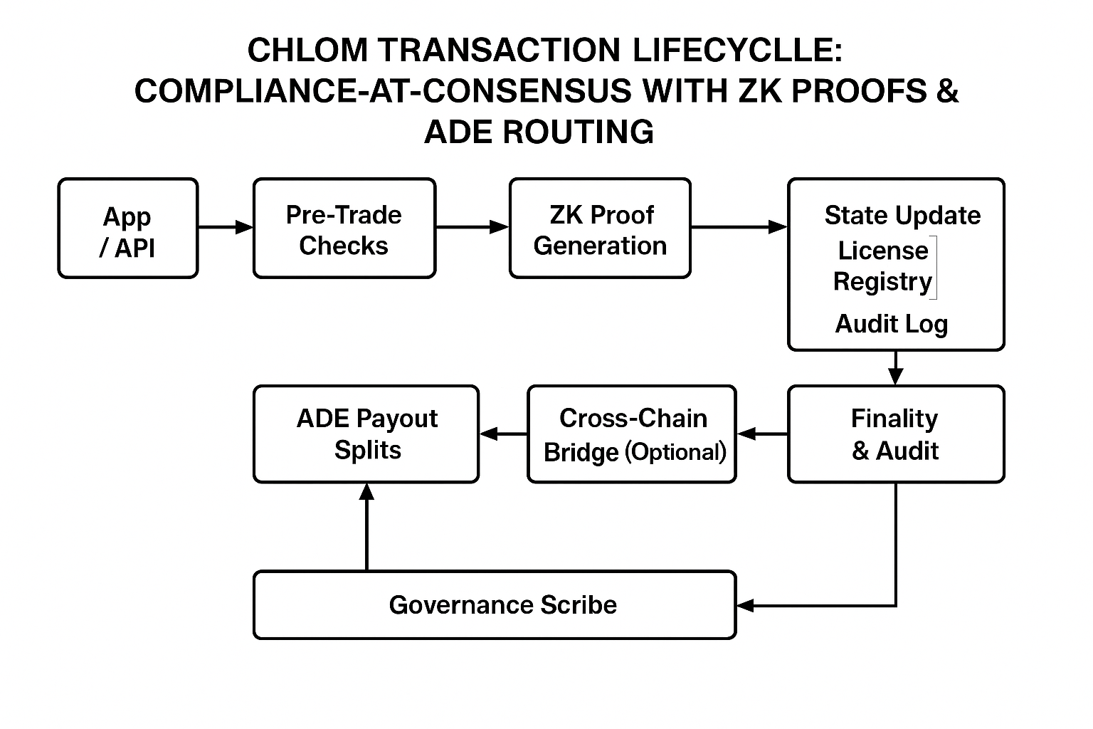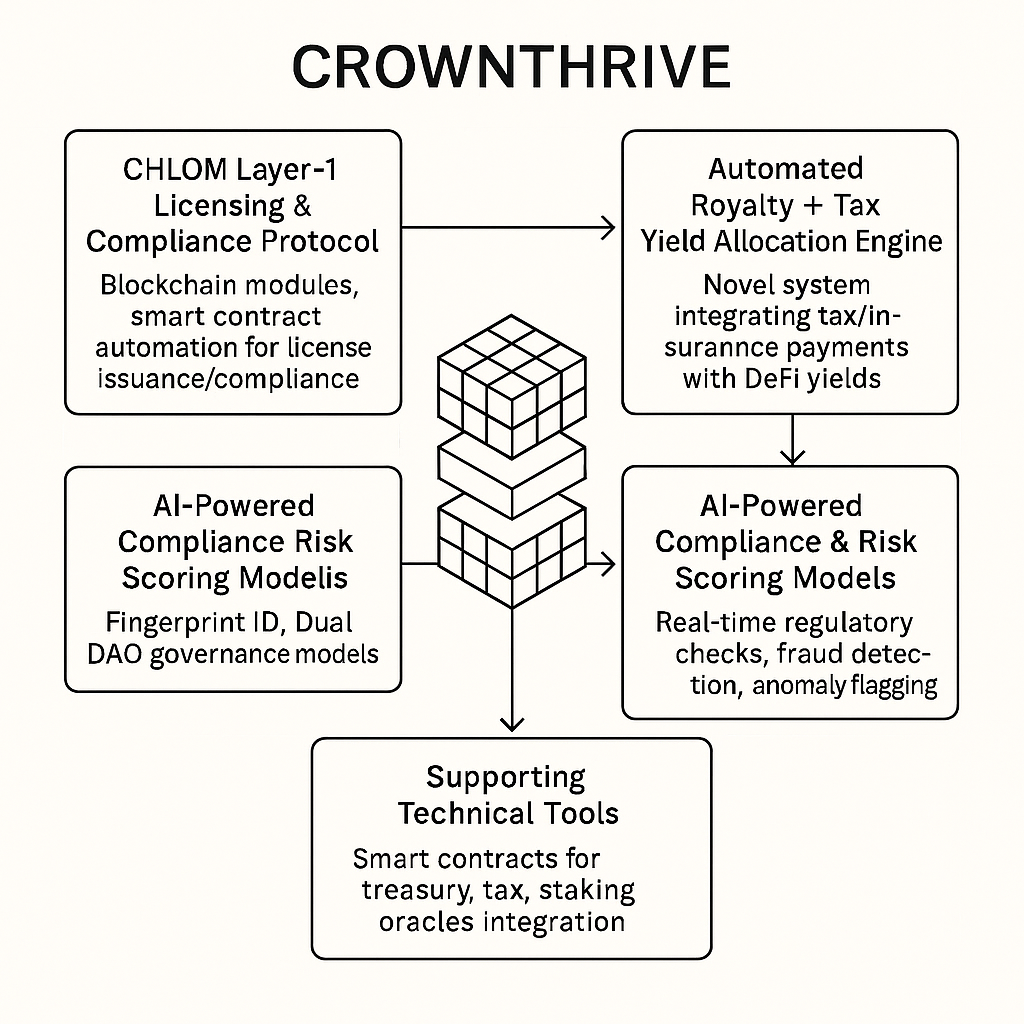 A blockchain-based compliance and licensing protocol (CHLOM™) integrating tokenized licenses, AI-driven risk scoring, Zero-Knowledge Proofs, automated royalty/tax allocation, and governance enforcement at the consensus level. The system ensures compliance-before-trade across industries, supports privacy-preserving verification, and automates multi-party payouts via programmable smart contracts.
