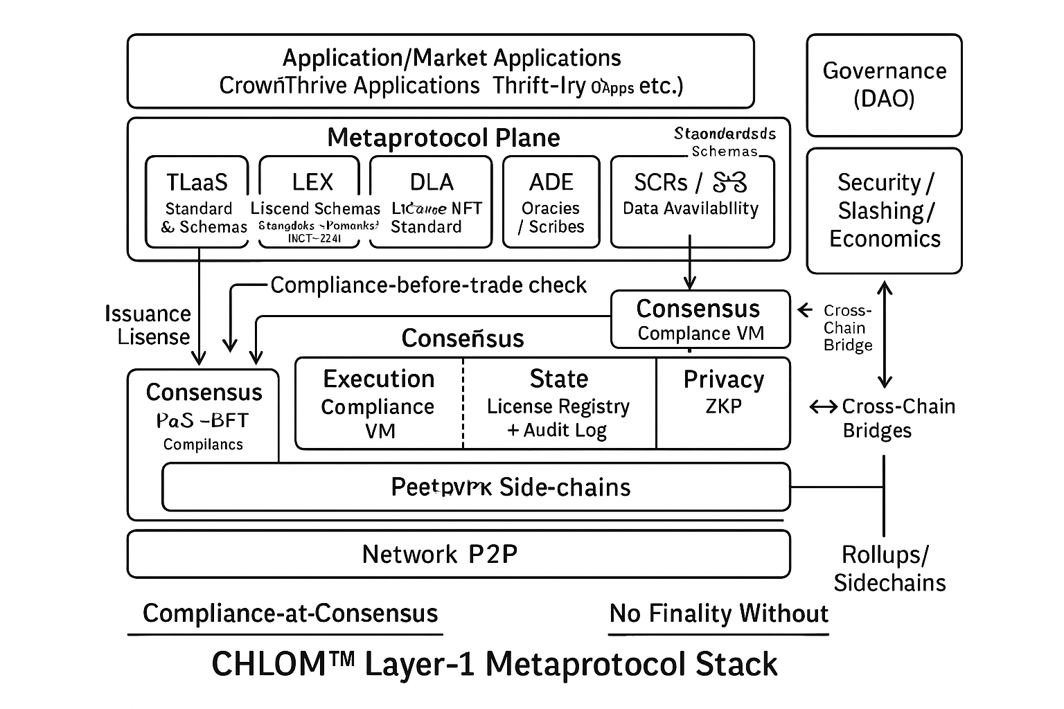 - CHLOM™ Blockchain – A dedicated Layer-1 consensus mechanism embedding compliance checks in block validation rules.