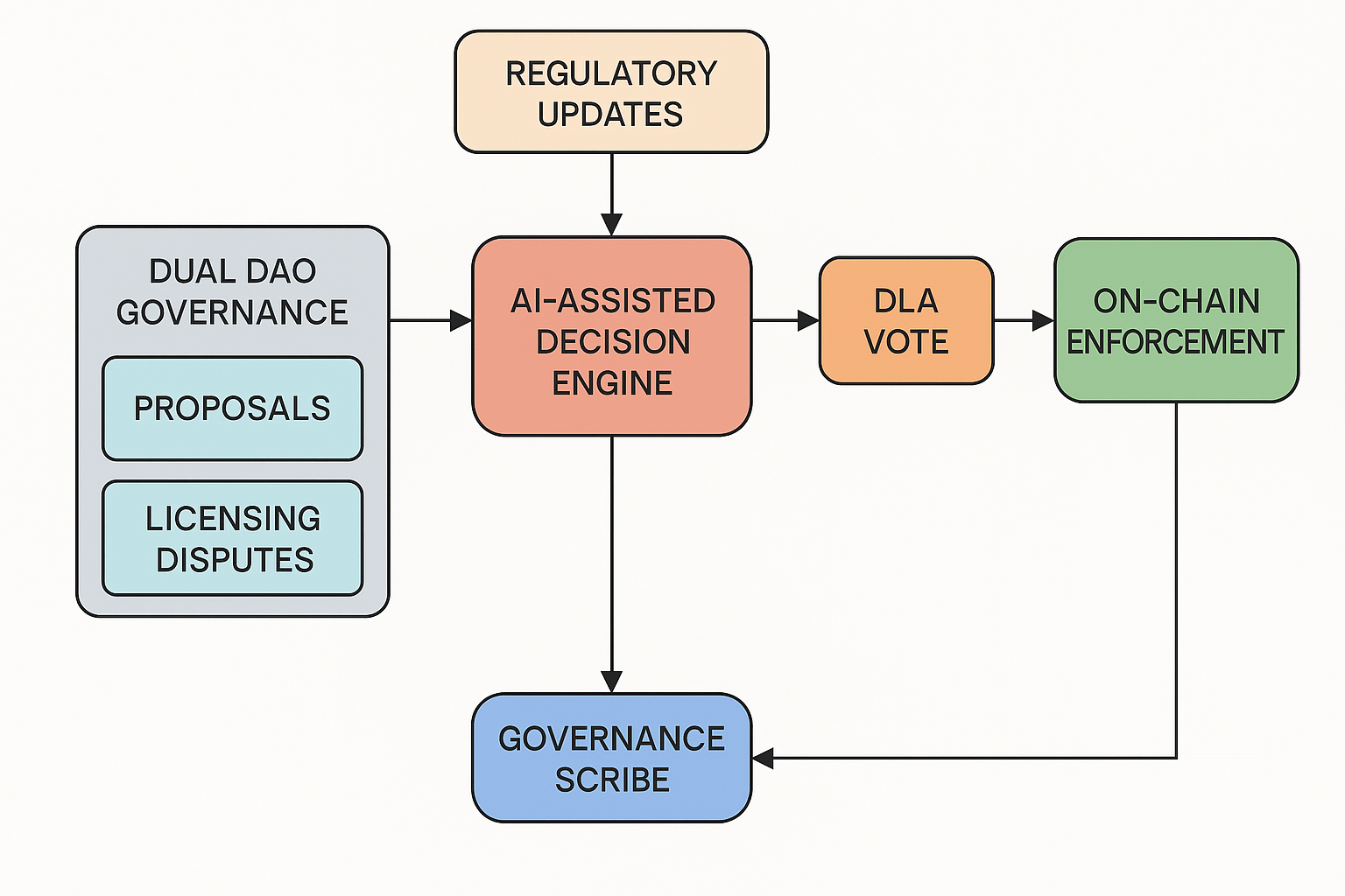 - FIG. 6: Governance model with DLA node voting and Governance Scribes logging.