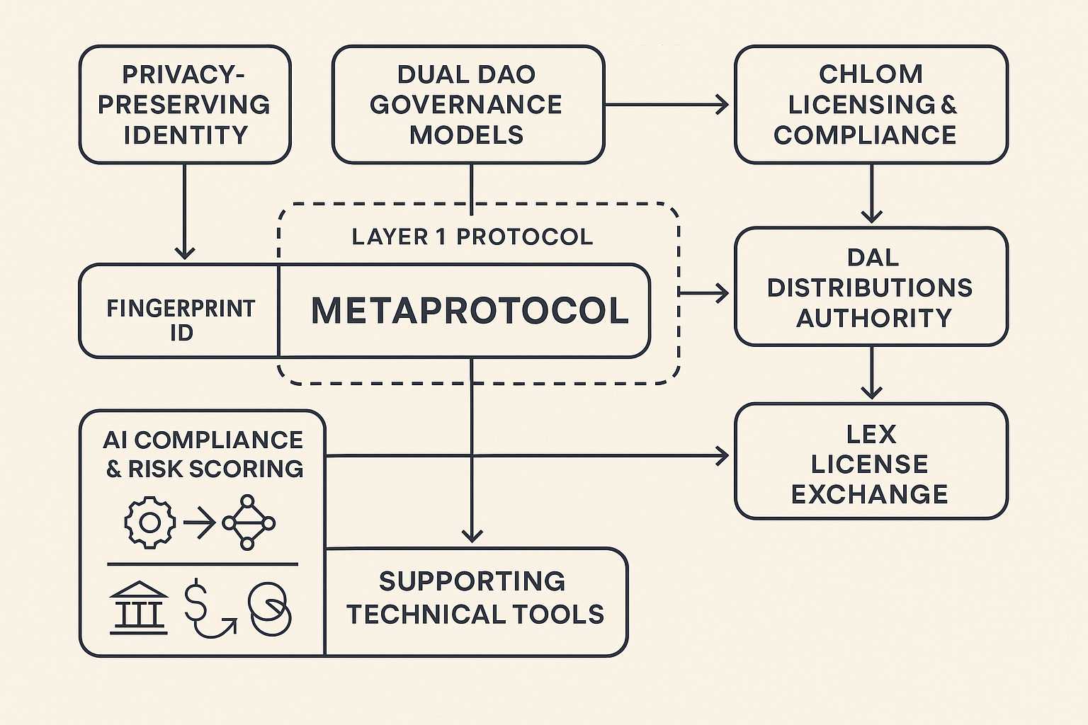 - Decentralized Licensing Authority (DLA) – Governance body with AI-assisted decision engines for license management.